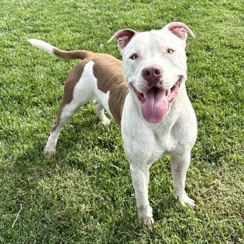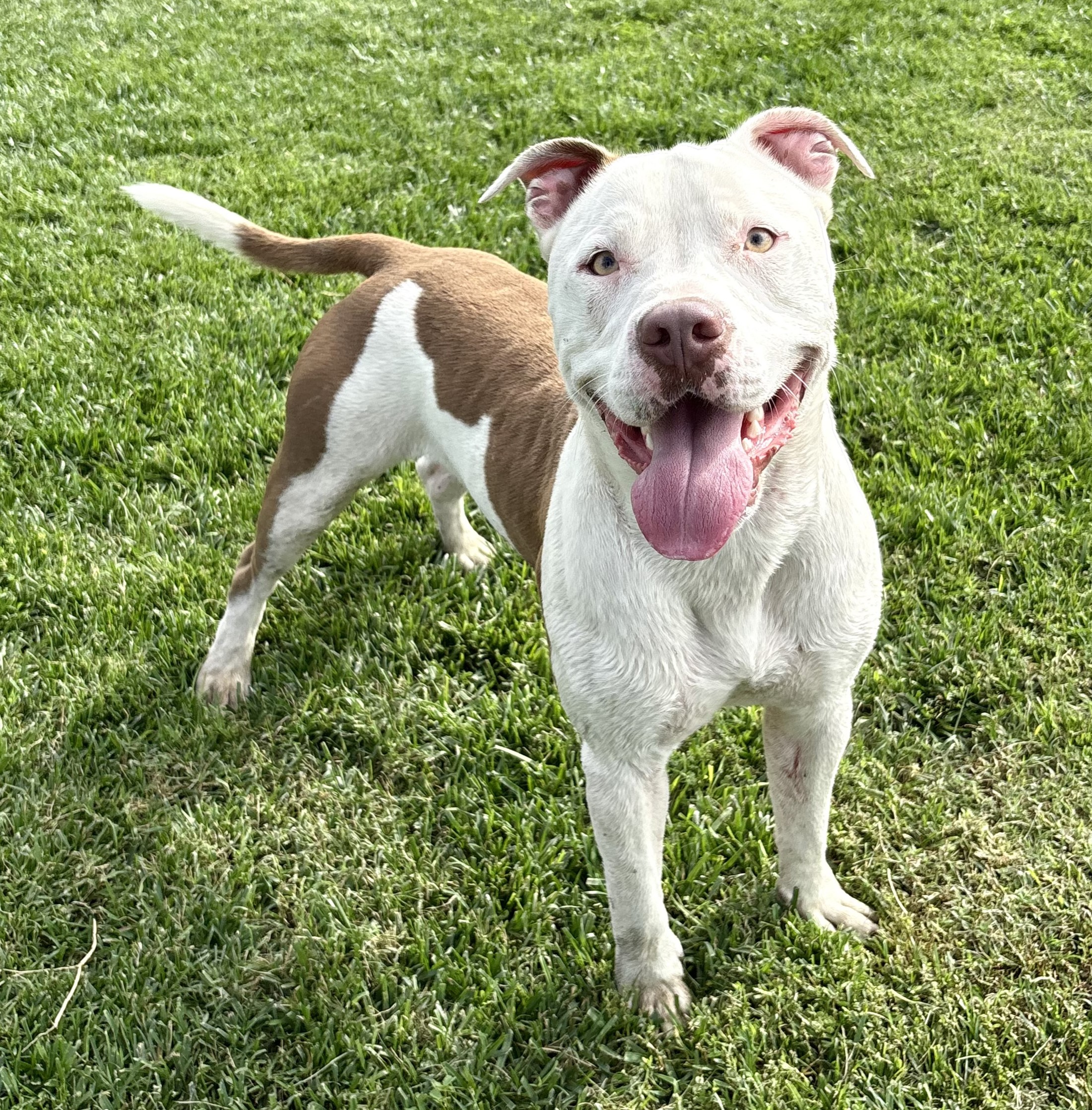 Meet Ghost! This sweetie pie is a wonderful little pitbull mix. Sadly, he was found as a stray, but you'd never guess it from his loving nature. Affectionate and gentle with his finders and the shelter staff, he's always ready for cuddles and companionship. He goes out with other dogs his size every day and plays well - he runs right for the doggie pools first though! Any dogs in the home would need to join the meet-and-greet so we know everyone gets along. After he's done playing, he's a calm boy who walks well on the leash, so someone had put a bit of work into his training before he arrived with us. Any status on housetraining is to be determined by his new owner. He's hoping to find a forever home where he can give — and receive — all the love he deserves. He is neutered, vaccinated, and microchipped, so he's all ready to go home today! $350 adoption fee.