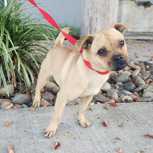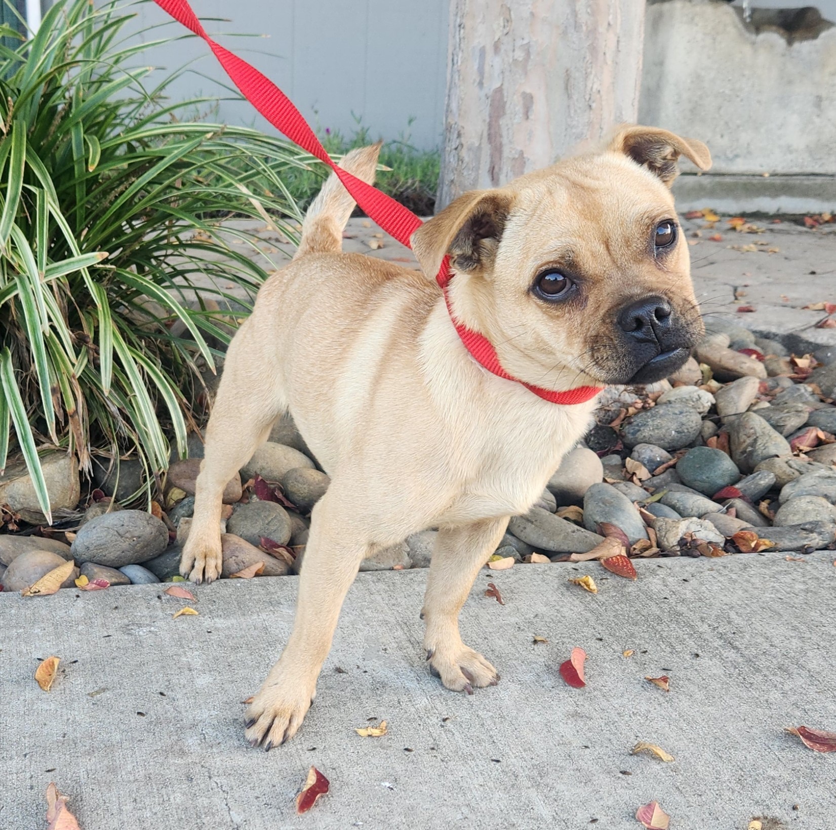 This handsome boy is Bonsai! He's a young pup based on his teeth, so we estimated him to be around 10 months old, and he weighs 16 pounds. He's an interesting mixed-breed pup that looks like someone placed a pug head on a Jack Russell body! Bonsai was found by a kind person working in the area who brought him to us so he could have a safe place to stay. He has already shown his gentle nature; his temporary finder noted he got along well with their medium-sized dog. He also seems to be a pro at road trips, as he rides very well in the car. Since we just met him, we are unsure about his history with housetraining, cats, or young children, but his easygoing demeanor suggests he is ready to learn and adapt to his new environment. He is pretty vocal, so apartment-dwellers may not appreciate his songs.