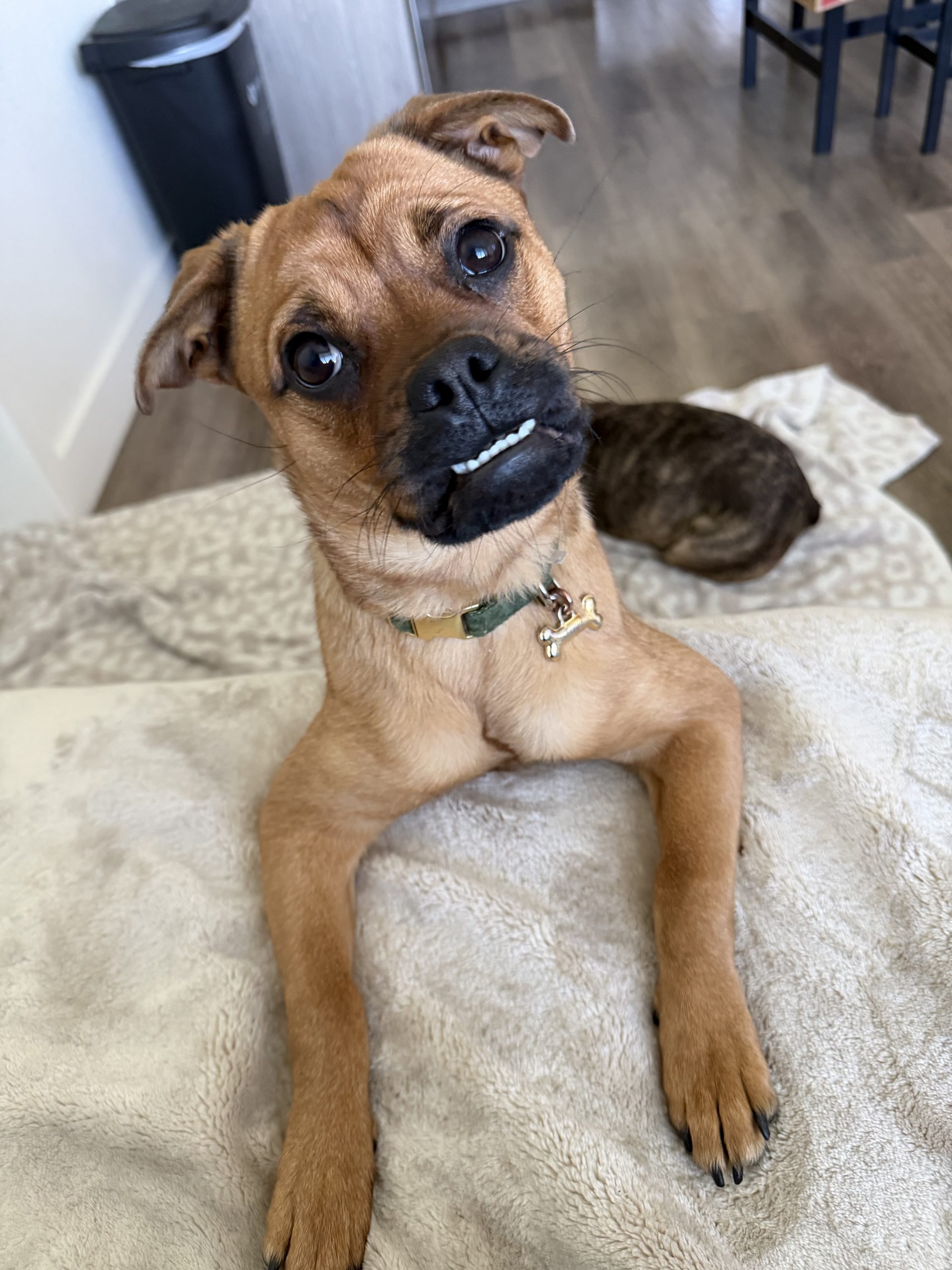 This pretty face is Freya! She is about 6-8 months old and appears to be a Chihuahua/Pug mix (lovingly called a "chug"). She's a great size at only 21 lbs. Sadly, she had to be rehomed due to a new baby in the home. She's a wonderful girl though, and has good experiences with other dogs and children as young as 9. Freya has some pretty great manners, and she’s smart and food-driven! She mastered the "sit" command and her housebreaking has been a breeze when kept on a consistent schedule. Freya enjoys car rides in the passenger seat for your next errand or road trip. Freya is looking for a family to call her own for an adoption fee of $350. Apply on our website www.petsnpals.org if you'd like to meet her!