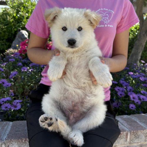This cute puppy is a combo of Husky and Pyrenees and was born 1/27/26.  Puppy will be large and hairy when fully grown, but will be so much fun!  Owner had a Pyrenees and Husky loose on the property and had an unexpected litter.  We have started puppy on the first set of shots and will be altered and microchipped before leaving the shelter.  If you want a lovely, large-breed pup, we've got you covered!  $350.00 adoption.