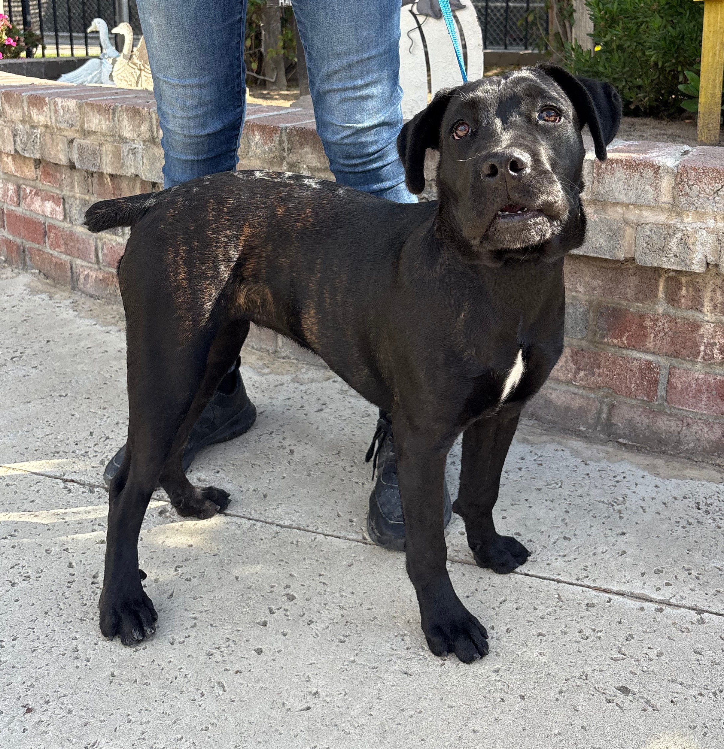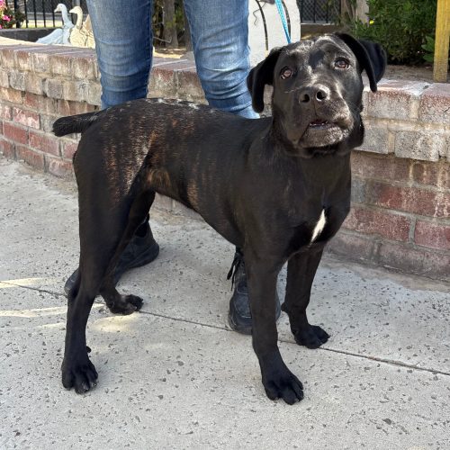 Meet Karlee, the lovely pooch with a big personality. She was born 5/11/2025. She's a delightful mystery, a one-of-a-kind blend that looks like a little English Bulldog got mixed up with a Black Labrador (she has a nub tail!). Since she was a stray, we don't know her exact family tree, but we're pretty sure she's part snuggle bug and part goofball. At just 35 pounds on intake, Karlee is a nice medium size with some growing left to do. She's got the charming, squishy face of a bulldog and the soulful, kind eyes of a lab. Her body is a perfect combination of sturdy and sleek, and her shiny black coat is just begging for a good belly rub. Karlee is still a young pup, so she's full of silly energy and loves to play. $350 includes her spay, vaccines, and microchip.