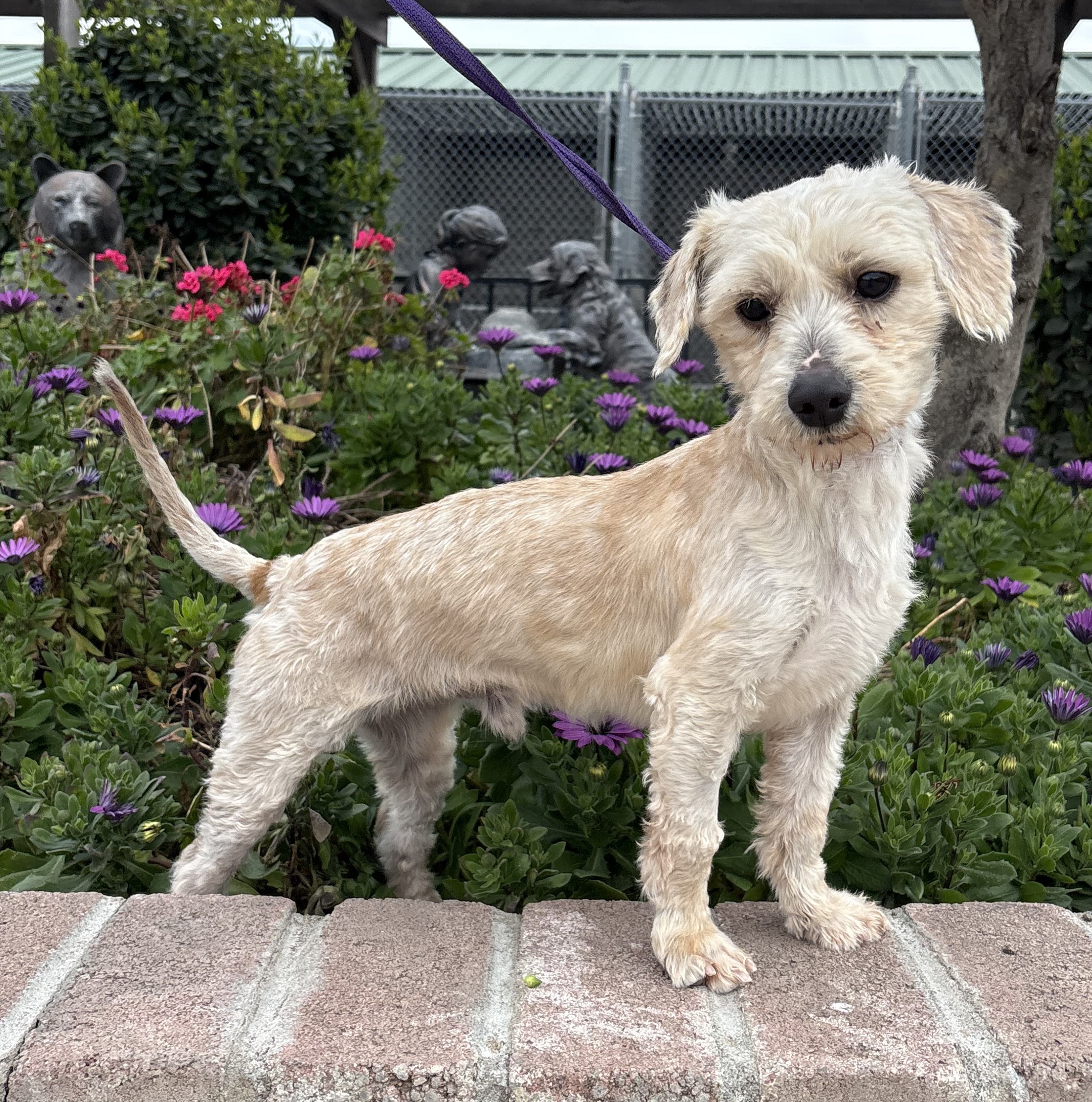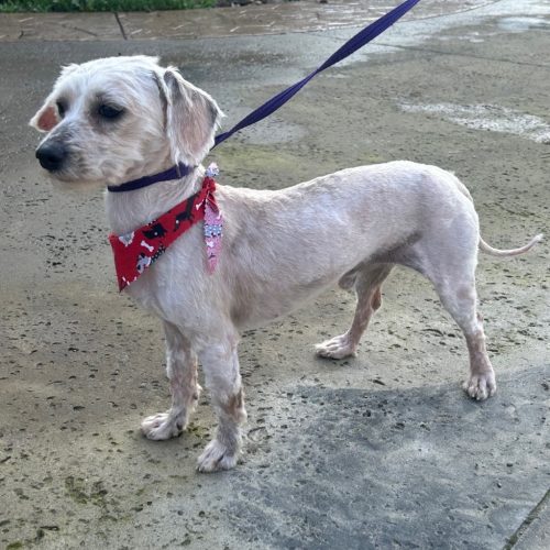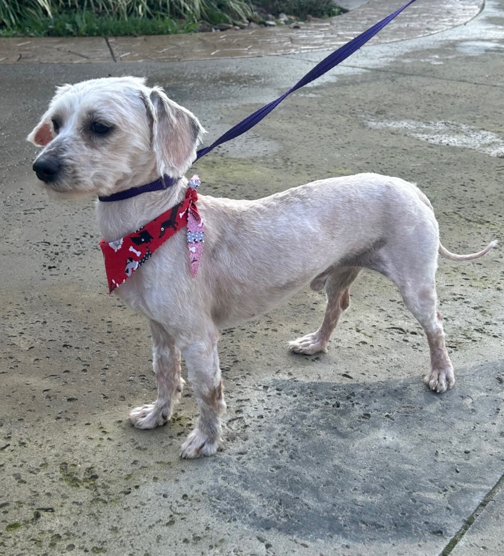 Knox came in to the shelter in very bad condition on the outside, but on the inside, this love-bug has a heart of gold. Even in the horrible condition of his fur, he had kisses for the staff and wanted to be held. He came in with another female who was also in bad condition. We immediately took him to the groomer and had all the hair stripped off. You can see in the "before" picture how bad he was. He and the female (Indie) seem very bonded and may be related, so we will try to adopt them together if possible. He had been seen wandering through parking lots in Stockton for a week before arriving, so we do not know where he was living before here. New owner should be prepared to work on house manners in case he hasn't had any prior training. The vet estimates he is between 1 and 3, so we settled on 2. Dog will need regular grooming in the future. $350.00 adoption will help us with the grooming, vaccinations, microchipping and neuter. Let's get this good boy a much better home.