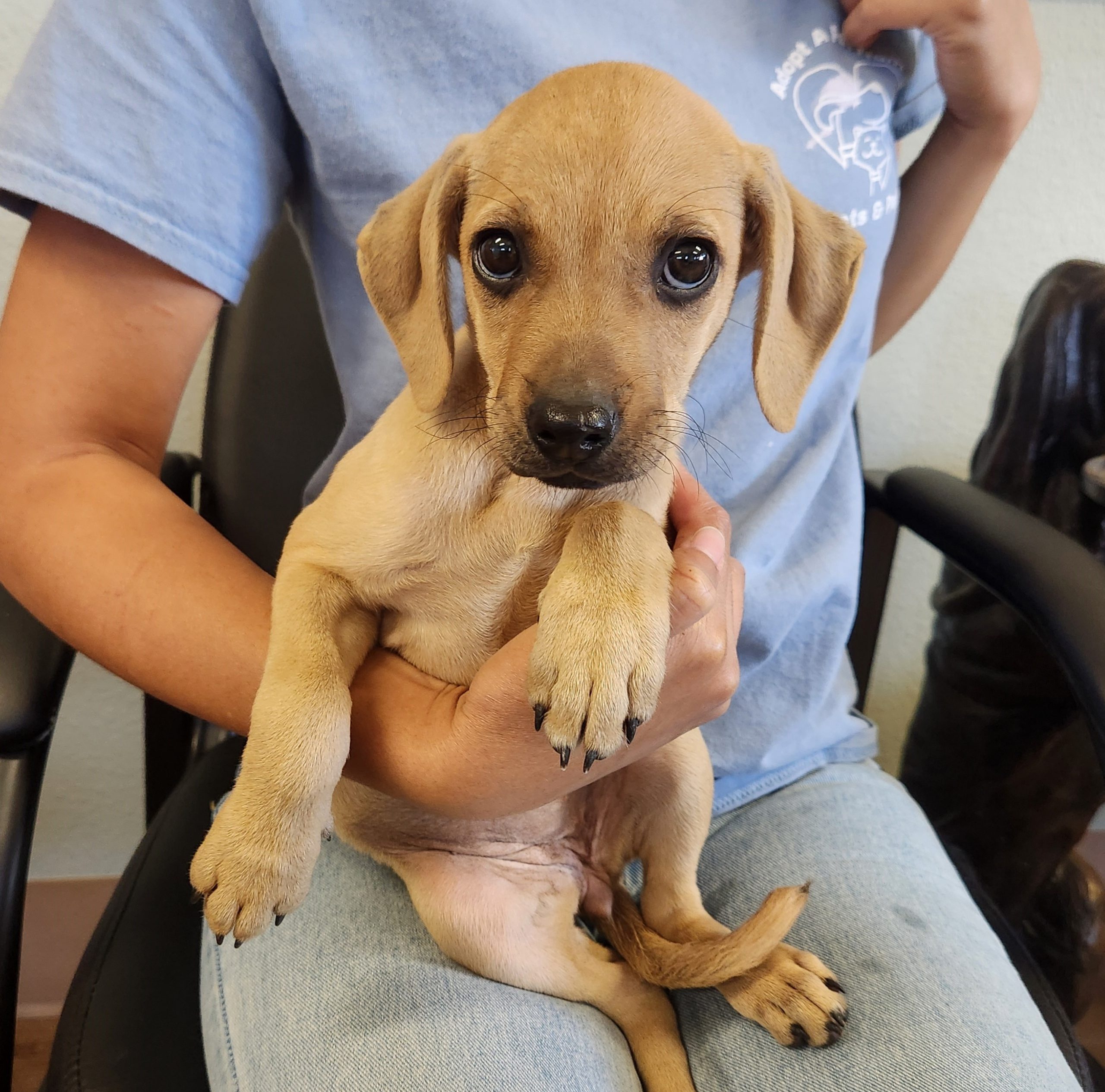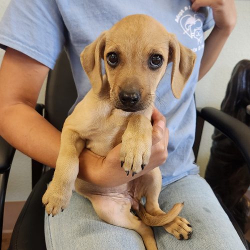 Meet London, a sweet, doe-eyed puppy! London is estimated to be about 8-10 weeks old based on her tiny white baby teeth. She was brought in by a couple who found her wandering on her own. She was boney and in desperate need of a bath, so it was clear she had been on her own for a period of time, but after some TLC, she's a brand new pup! No owner was located, so we are currently accepting applications for her. We can never be sure about the breed or estimated adult weight when they come in as strays, but she has a pointer/yellow lab look to her. We don't know much about her, but we do know London loves to run and play! Someone looking for a good-sized pup would love her! To apply for her, please visit our website at www.petsnpals.org. The adoption fee of $350 includes her spay, microchip, and all initial puppy vaccines. She will be spayed on October 2nd and can go home the next day.