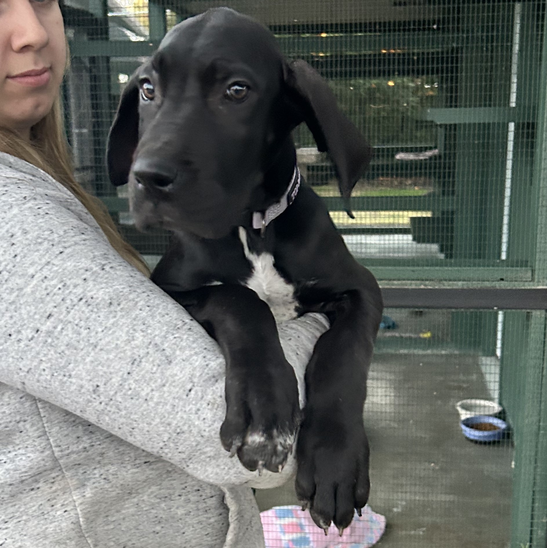 Meet our sweet Great Dane puppy, Rainy! Estimated to be around 8 to 10 weeks old, she was found as a stray in Lathrop, wandering down on Manthey Rd. Although we don’t know if she has received any formal training yet, she has a calm and friendly demeanor, making her a wonderful companion for any family. She was in the care of the kind people who found her for just one night, so we are still learning more about her personality. She is only a young pup, but she is already 26 lbs. and is sure to be an XL dog when she is fully grown. She will need plenty of space and consistent training. This little girl is currently on a stray hold until 12/2, to give her owners a chance to claim her. After that, she will be spayed and ready to find her forever home. If you’re looking for a loyal, loving, and adorable pup to join your family, this Great Dane girl might be the one for you! An adoption fee of $350.00 will cover the cost of her spay, vaccinations and microchip. Apply for her at www.petsnpals.org for a chance to give her the loving home she deserves.