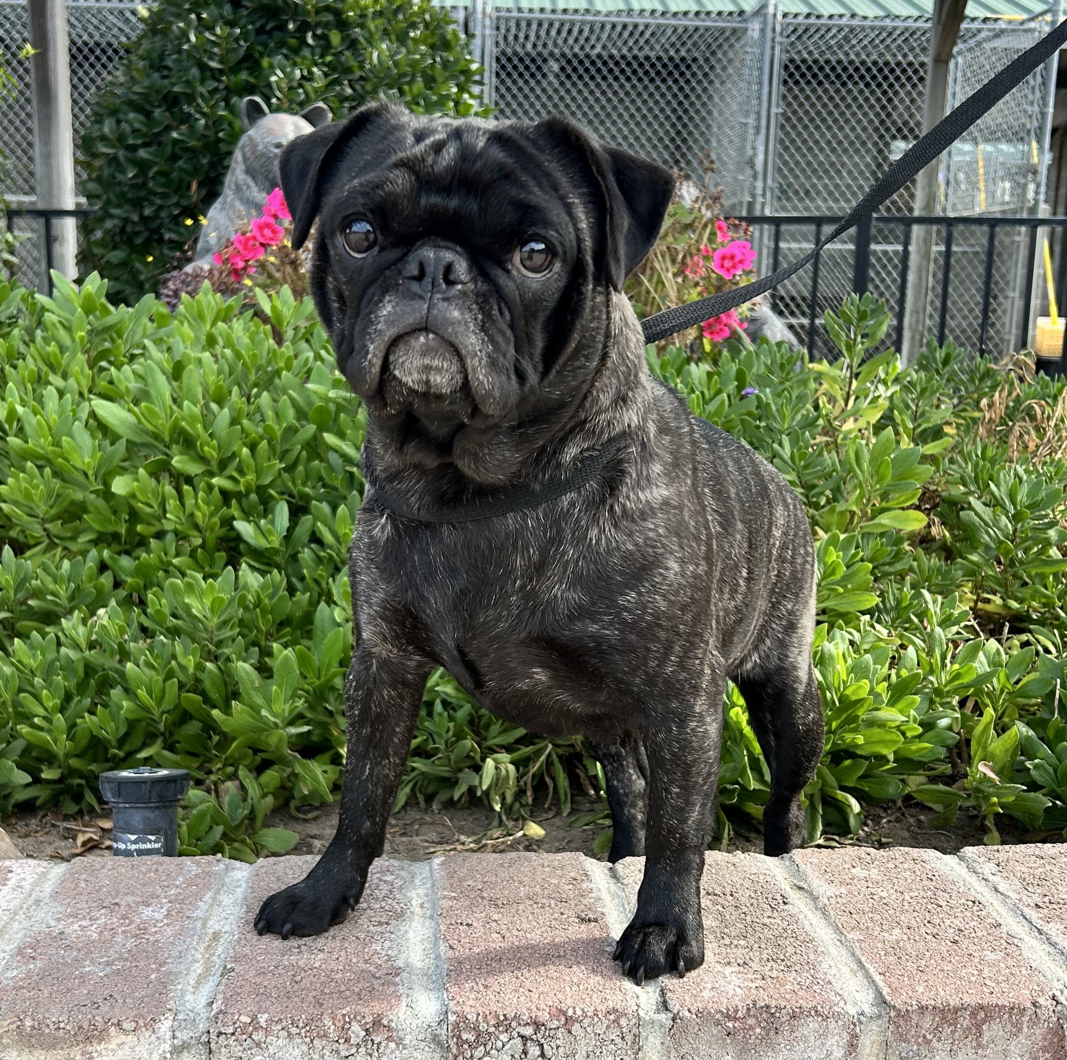 Meet, Alberta! This adorable 4–5-year-old female brindle Pug was found as a stray and has quickly won everyone’s hearts with her sweet, affectionate personality. She’s got the most expressive little face; one look into those big eyes, and you’ll be smitten!