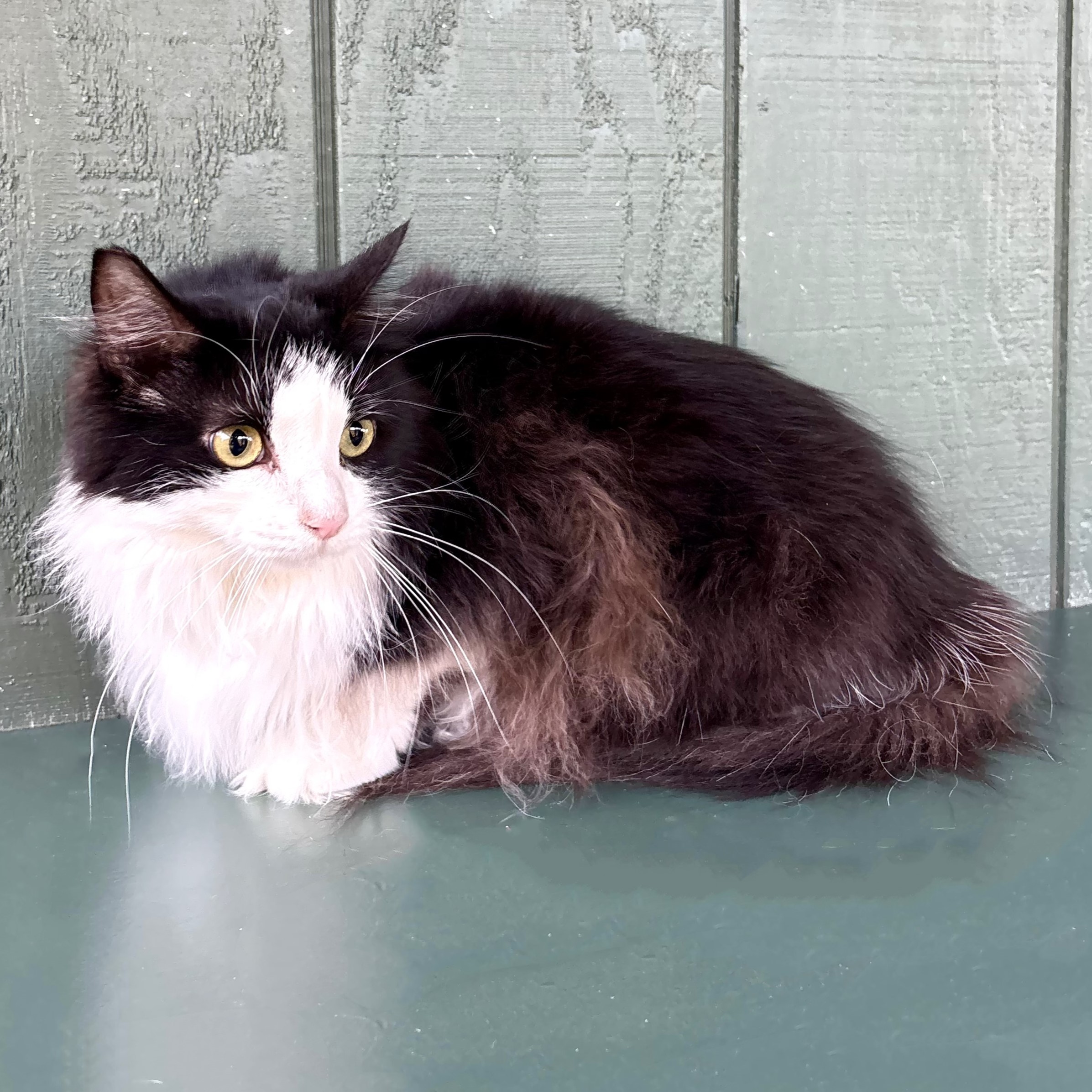 Bean is a stunning 4-year-old long-haired tuxedo cat searching for her forever family! This petite lady is a true gem, weighing in at a dainty 7 lbs. Bean is noted to be incredibly friendly, but she's not happy being in a shelter since she's been raised in a home for 4 years! She is a bit shy due to this, but she has a big heart full of affection to share if you talk to her and pet her a bit. She's a very gentle and mellow lady. Bean is also used to living with other cats, so she currently resides in a catio with other adoptable cats and everyone seems to be getting along just fine. She's an excellent candidate if you already have feline friends. She is fully vetted and ready to go home immediately; she is spayed, vaccinated, and microchipped. You can welcome this beautiful and sweet companion into your life for an adoption fee of $125. Apply for her today at www.petsnpals.org!