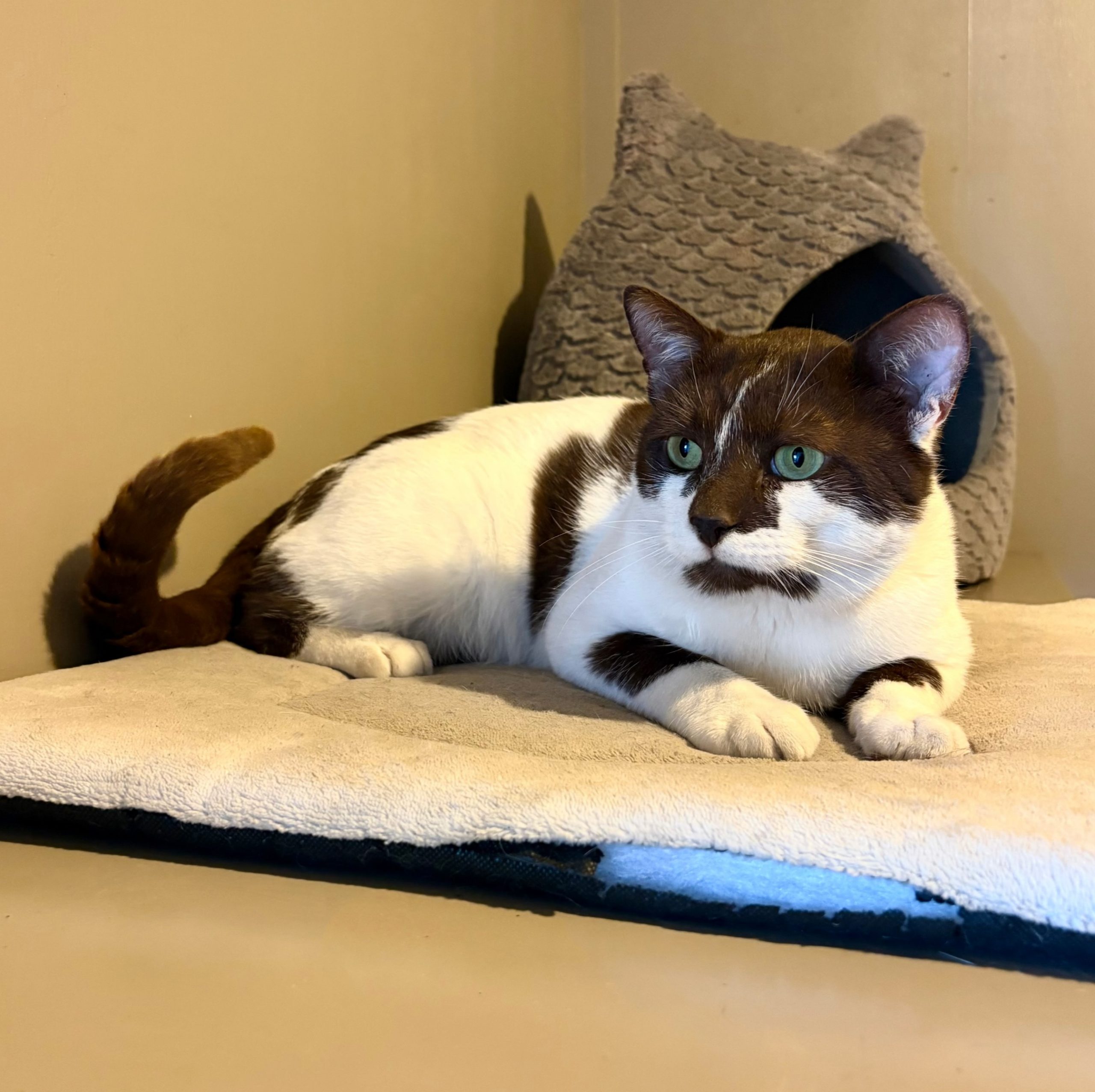 Corky is a handsome 2-year-old domestic shorthair with a charming personality and an eye-catching coat. Mostly white with large, chocolate brown spots, his unique markings make him stand out in any room. Corky isn’t just good-looking, he’s also a sweetheart who responds to his name and enjoys gentle attention from his favorite humans.